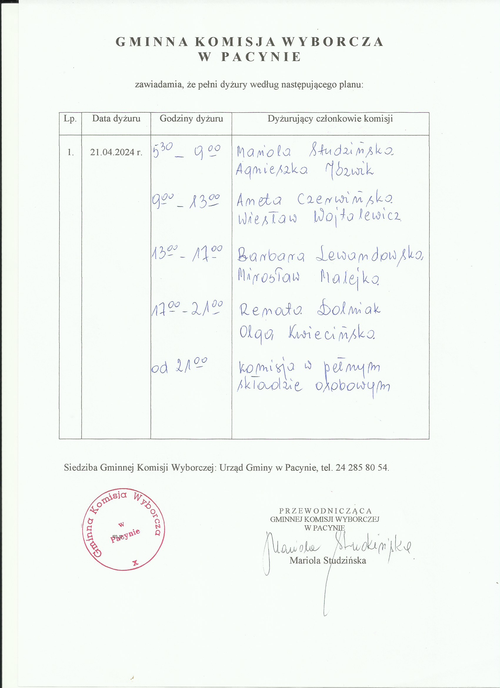 Harmonogram dyżurów Gminnej Komisji Wyborczej w Pacynie.
