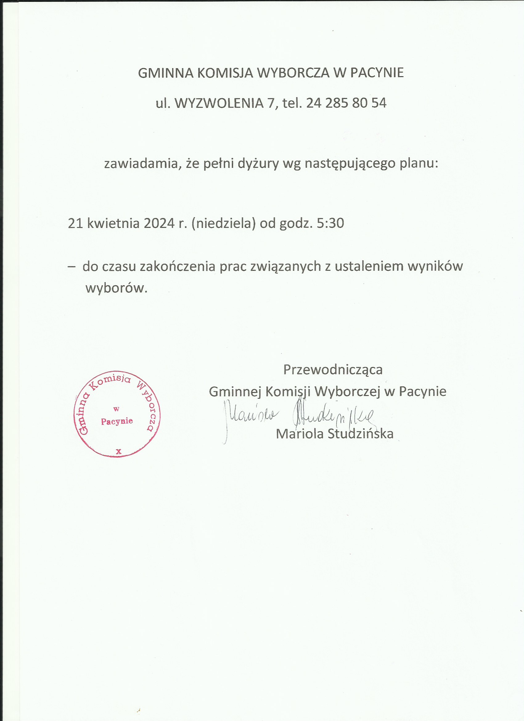 Gminna Komisja Wyborcza w Pacynie - informacja o dyżurze.