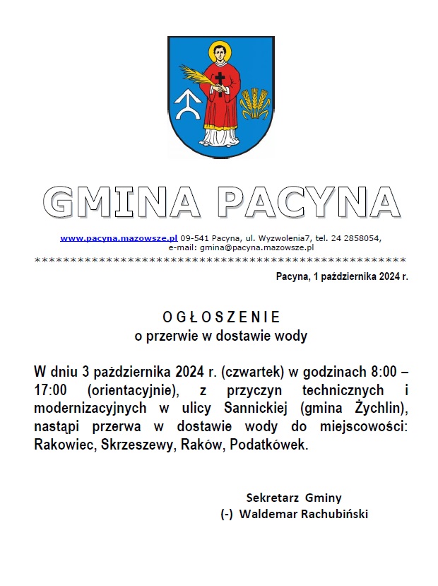 W dniu 10 września 2024 r. (wtorek) w godzinach 8:00 – 20:00 (orientacyjnie), z przyczyn technicznych i modernizacyjnych w ulicy Sannickiej i Orłowskiego (gmina Żychlin), nastąpi przerwa w dostawie wody do miejscowości: Rakowiec, Skrzeszewy, Raków, Podatkówek.