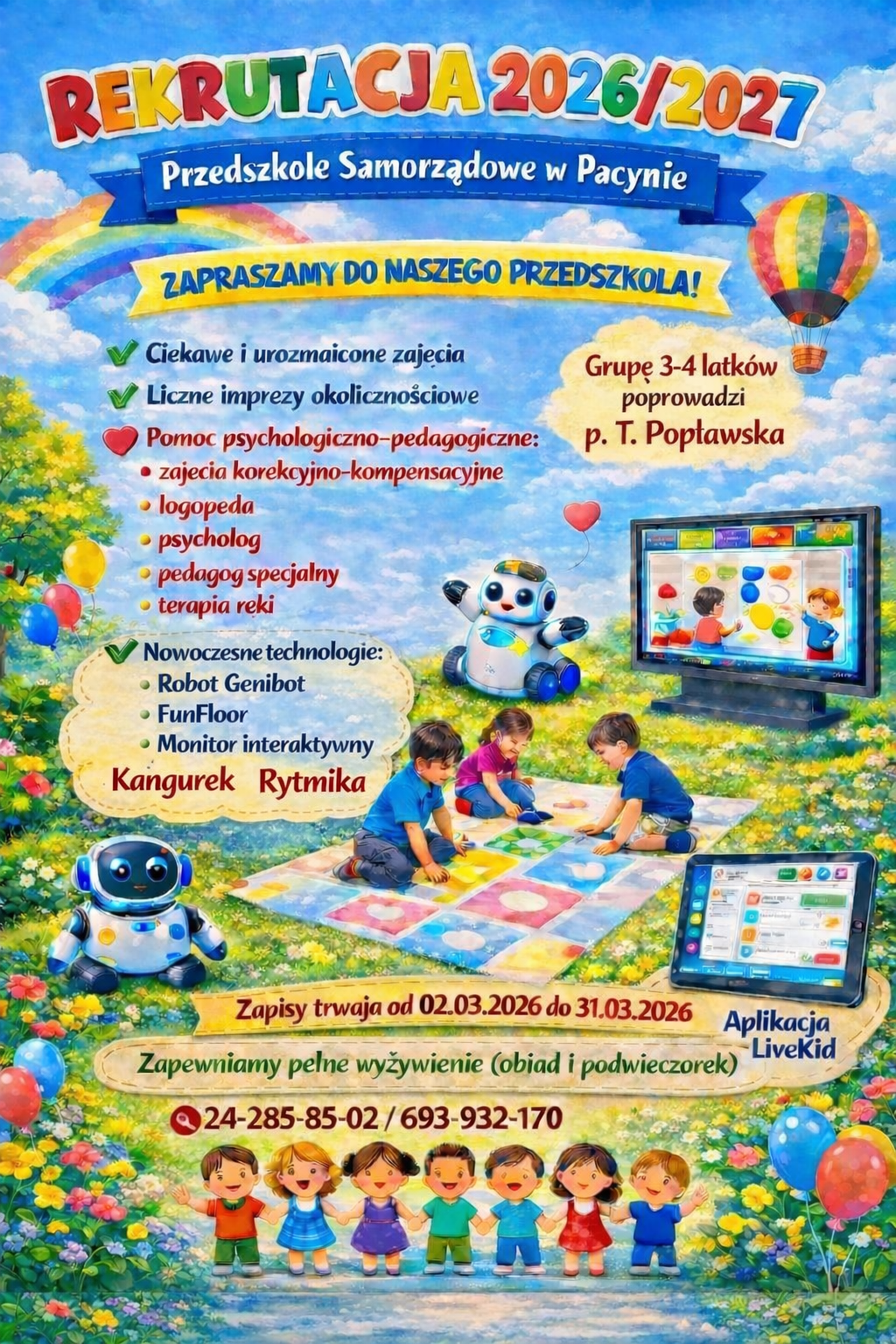 Rodzice dzieci już uczęszczających do przedszkola składają Deklarację o kontynuowaniu wychowania przedszkolnego w roku szkolnym 2026/2027 do dnia 27.03.2026 r.
